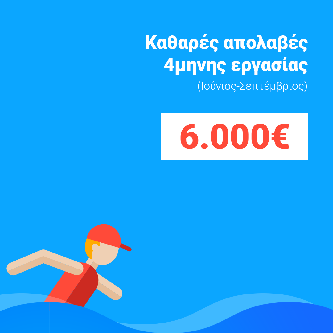 Οι απολαβές ναυαγοσώστη θάλασσας στη Lifeguard Patrol, ανέρχονται στα 5.200€ καθαρά και αφορούν 4μηνη, πλήρη απασχόληση (Ιούνιος-Σεπτέμβριος).